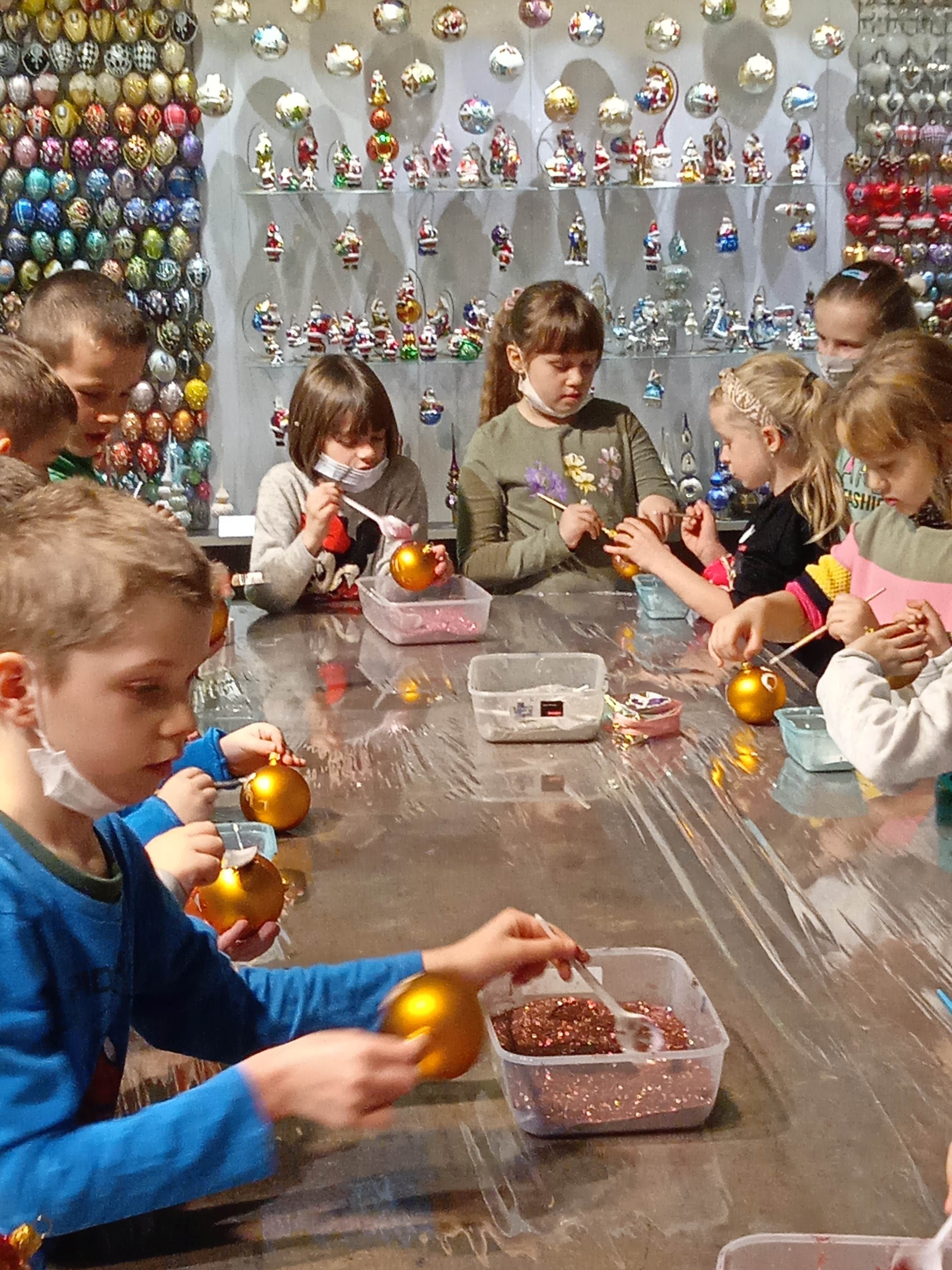 choinkowych. Zwieńczeniem wydarzenia był udział w warsztatach dotyczących części procesu produkcji bombek, ozdabianie i suszenie. Samodzielnie ozdobione bombki stanowiły cenną pamiątkę z wycieczki.