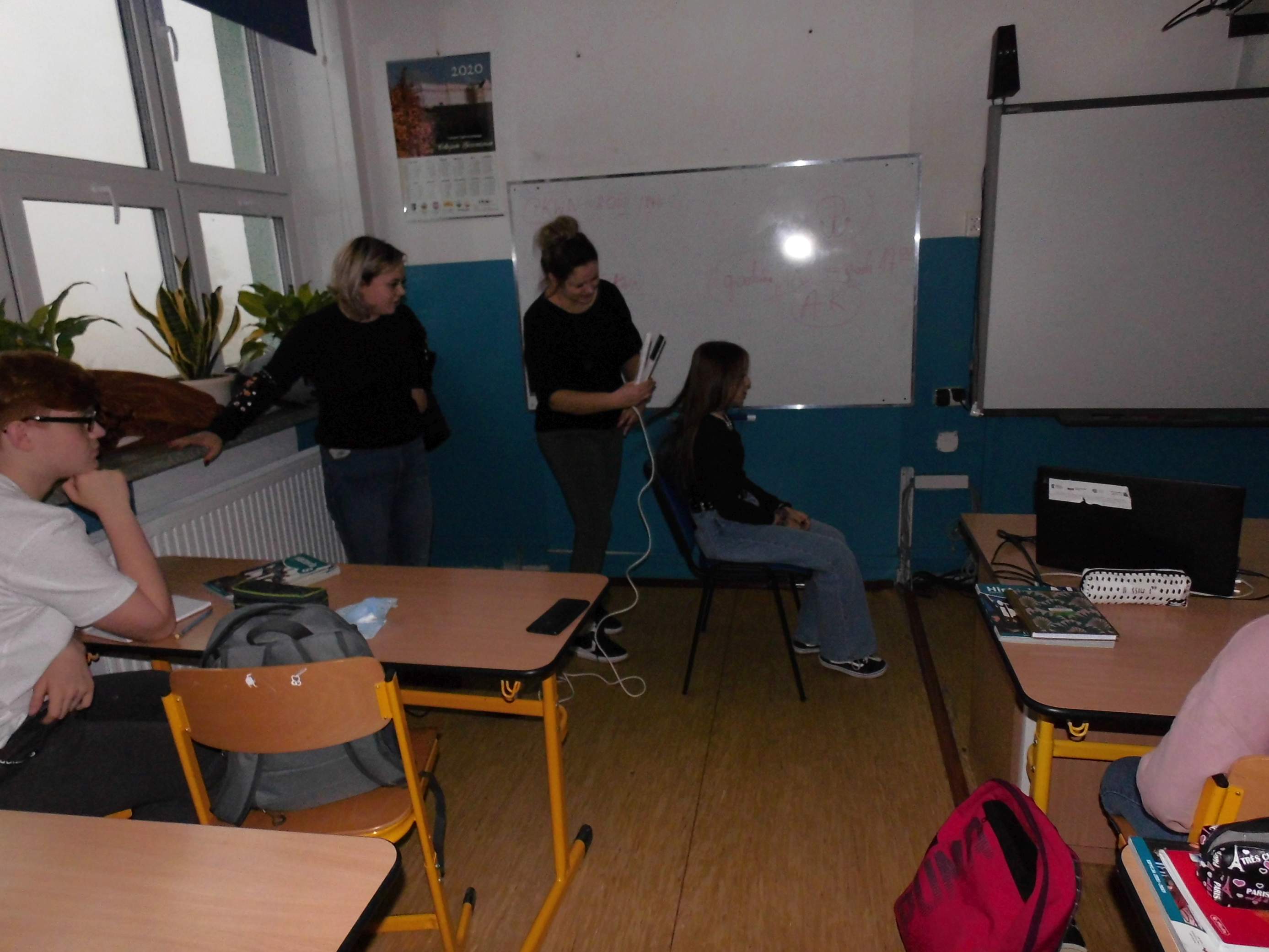 Zajęcia z doradztwa zawodowego nie muszą być nudne Aby było aktywnie i ciekawie zaprosiliśmy na zajęcia do klas 6-8 panią Małgorzatę Kwiatkowską właścicielkę tutejszego salonu fryzjerskiego "Kok i Lok" oraz panią Paulinę Paw. Nasi goście opowiedzieli młodzieży o tym, jak wygląda praca fryzjerki, w jaki sposób zdobywa się wykształcenie w tym kierunku i najważniejsze: