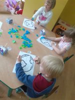 Grupa ,, Jagódki” stworzyła piękne kwiatowe kompozycje z darów naszej natury i wykonała pracę plastyczną, która ukazuje jak nasza planeta wygląda z kosmosu.