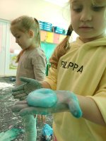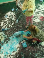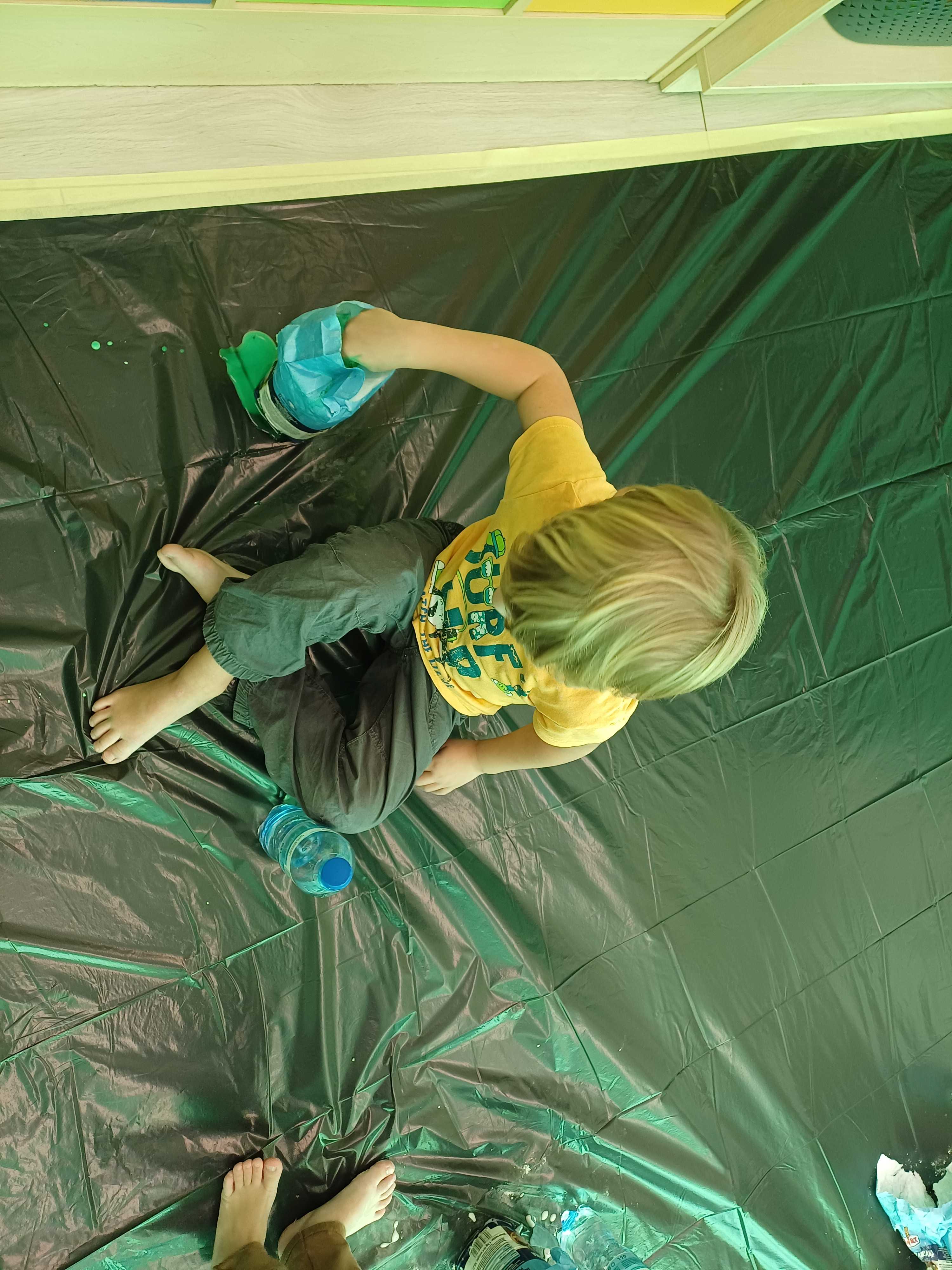 Nasi milusińscy podczas zajęć samodzielnie tworzyli różne masy plastyczne, oczywiście bez przepisu. Dzieci działały bez pośpiechu i każde we własnym tempie. Nikt nie zwracał uwagi na polepione, kolorowe stopy i dłonie. „Legalne brudzenie” zrobiło na dzieciach największe wrażenie – radości było co nie miara.