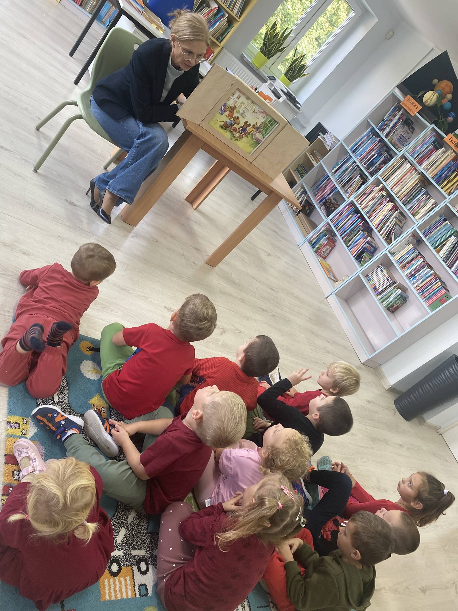 W ramach realizacji innowacji pedagogicznej „Czytanie na dywanie” odbyło się pierwsze spotkanie w bibliotece. Przedszkolaki z grupy ,, Jagódki” z wielkim zainteresowaniem zwiedziły wypożyczalnię i dowiedziały się, jak należy dbać o książki.
