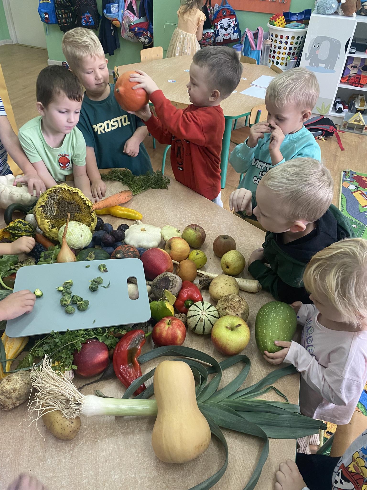 W grupie „Jagódki” odbył się wyjątkowy,, Dzień warzyw i owoców”. Dzieci przyniosły do przedszkola warzywa i owoce prosto z pola i ogrodu – pachnące jabłka, marchewki, pomidory, gruszki i wiele innych smakołyków. Podczas zajęć przedszkolaki poznawały różnorodne kolory, kształty, zapachy warzyw i owoców. Miały okazję dotknąć, obejrzeć i spróbować wybranych okazów, odkrywając ich smaki i tekstury – od chrupiącej marchewki po miękkie, soczyste śliwki. Zajęcia zakończyły się wspólnym przygotowaniem kolorowego kącika z przyniesionych darów natury.